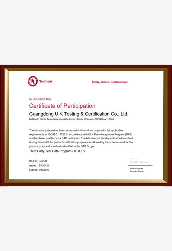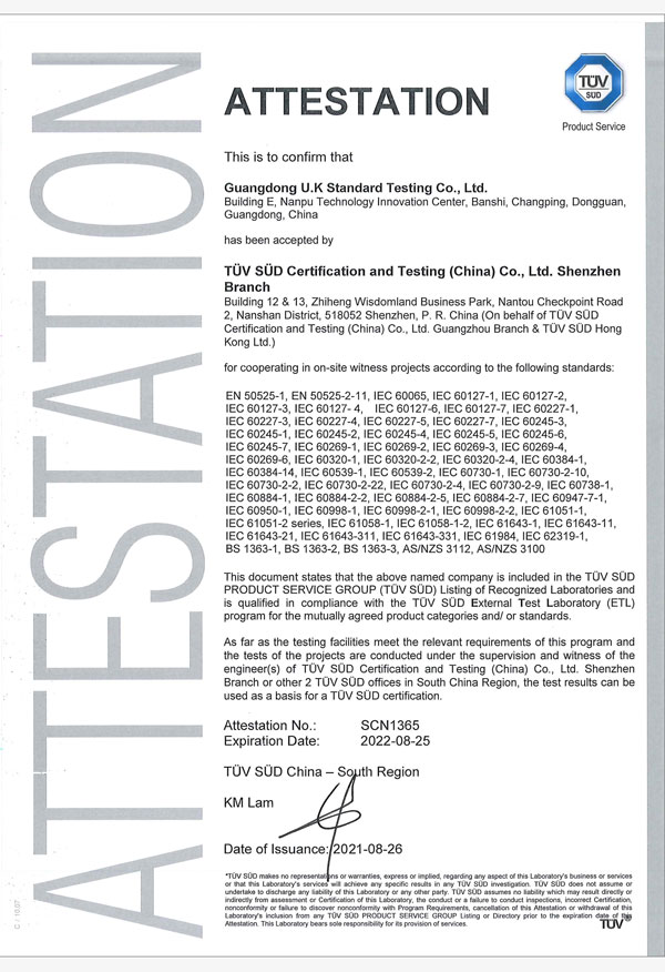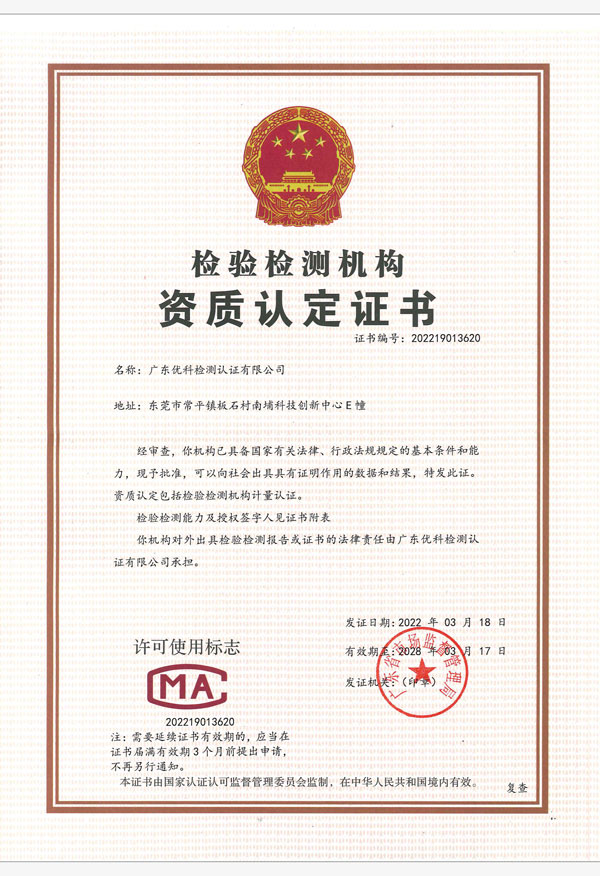 廣東優(yōu)科檢測認(rèn)證有限公司(簡稱:UKK)成?于2007年,是國內(nèi)專業(yè)的汽車整車及零部件、電子元器件第三方檢測實(shí)驗(yàn)室,國家級中小企業(yè)公共(技術(shù))服務(wù)示范平臺,獲得了國家?新技術(shù)企業(yè)、廣東省專精特新中小企業(yè)、市級工程技術(shù)研發(fā)中心等榮譽(yù)稱號。 More